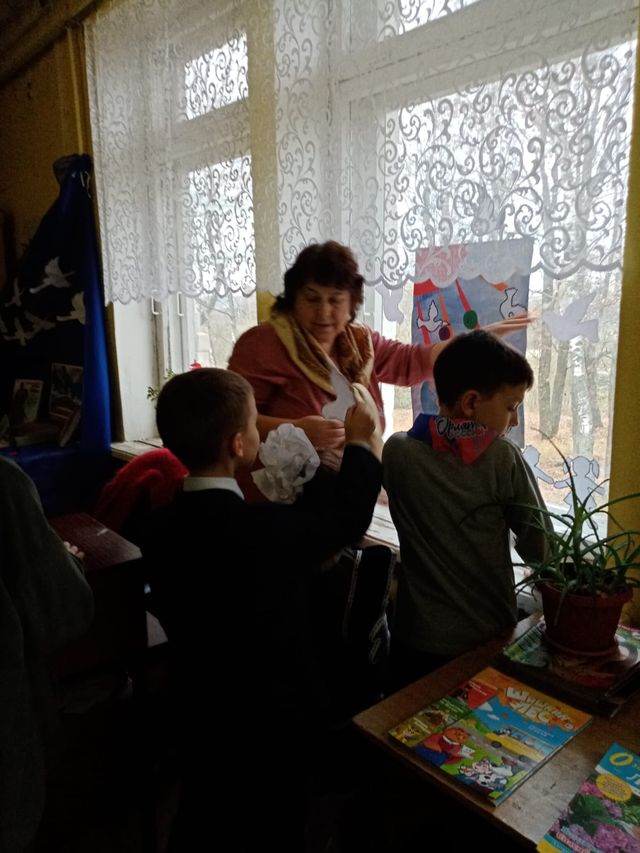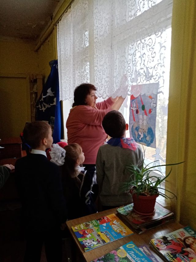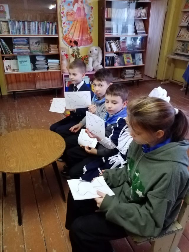 Затем прошел мастер-класс, где ребята вырезали из бумаги голубей и человечков. А затем вместе с библиотекарем украсили окно в рамках Всероссийской акции «Окна единства».