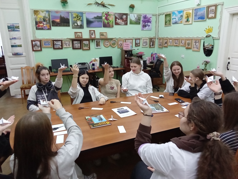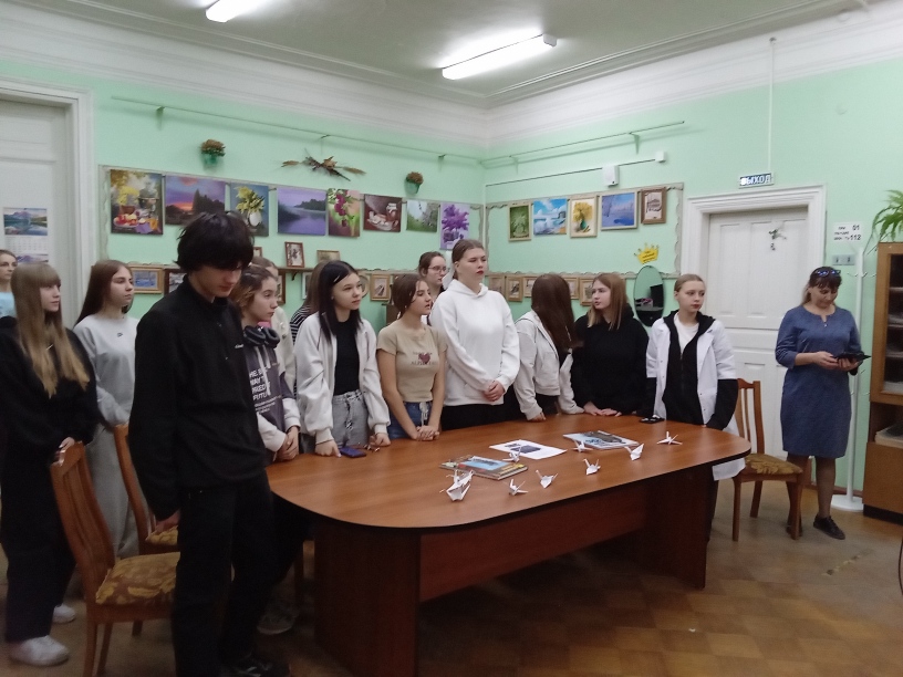Сотрудники центральной библиотеки провели для студентов Кашинского колледжа (преподаватель Караваева С.А.) литературно-исторический час «И превратились в белых журавлей». В начале мероприятия библиотекарь напомнила ребятам о том, как появился этот праздник, почему символом его стали журавли.