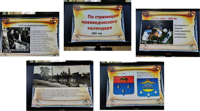 Также познакомились с другими знаменательными датами - в 1780 г. утвержден герб города Кашина, в 1810 г. в Кашине построен первый навесной мост через реку Кашинка, 1930 г. – год «Кашинского прорыва». Отдельный блок был посвящен М. И. Калинину, юбилей которого будет отмечаться 19 ноября. Все это сопровождалось показом презентации.
